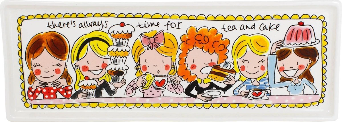Serveer de lekkerste cakes of taartjes op deze nieuwe vrolijke en kleurrijke cakeschaal uit de Blond Amsterdam Even Bijkletsen lijn. De opvallende en kleurrijke illustraties kenmerken de ‘Even bijkletsen’ lijn van de twee vriendinnen uit Amsterdam: een servieslijn met een knipoog.