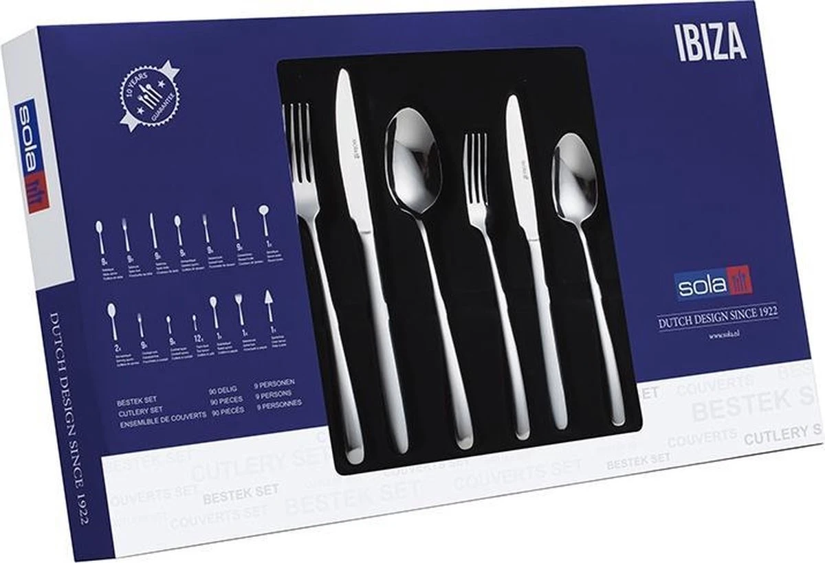 Met 100 jaar ervaring weet je dat je bij Sola goed zit. De besteksets van Sola staan bekend om haar speciaal ontworpen designs met daarbij horende restaurant geschikte kwaliteit en stijl. Elk stuk van onze Ibiza lijn is gemaakt van Zilver Chroomstaal 18/10, dat zowel duurzaam, roestbestendig en vaatwasser geschikt is.